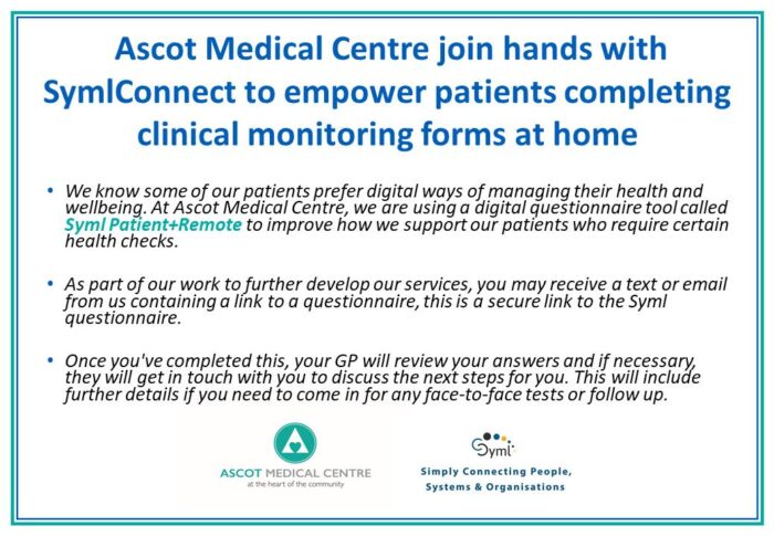 Ascot Medical Centre works in partnership with SymlConnect to deliver remote patient health monitoring